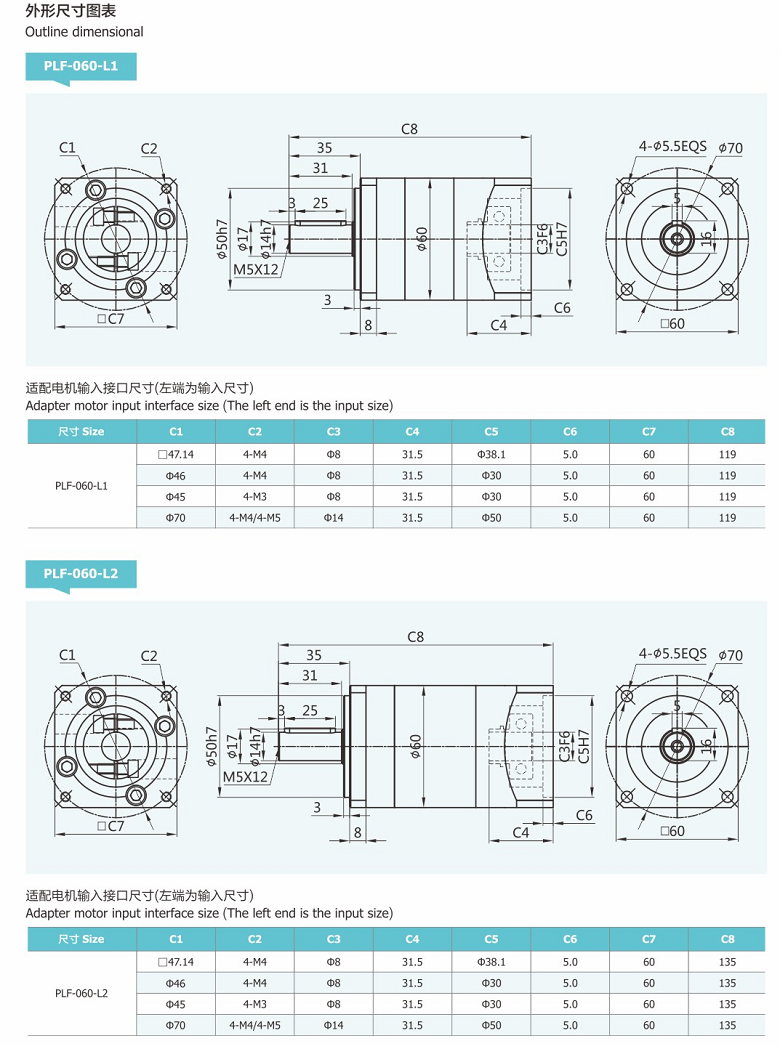 精密行星減速器PLF分別有60型號,80型號,90型號,120型號,減速比分別有L1,L2,L3段,可配各款無刷電機、伺服電機、步進電機。
